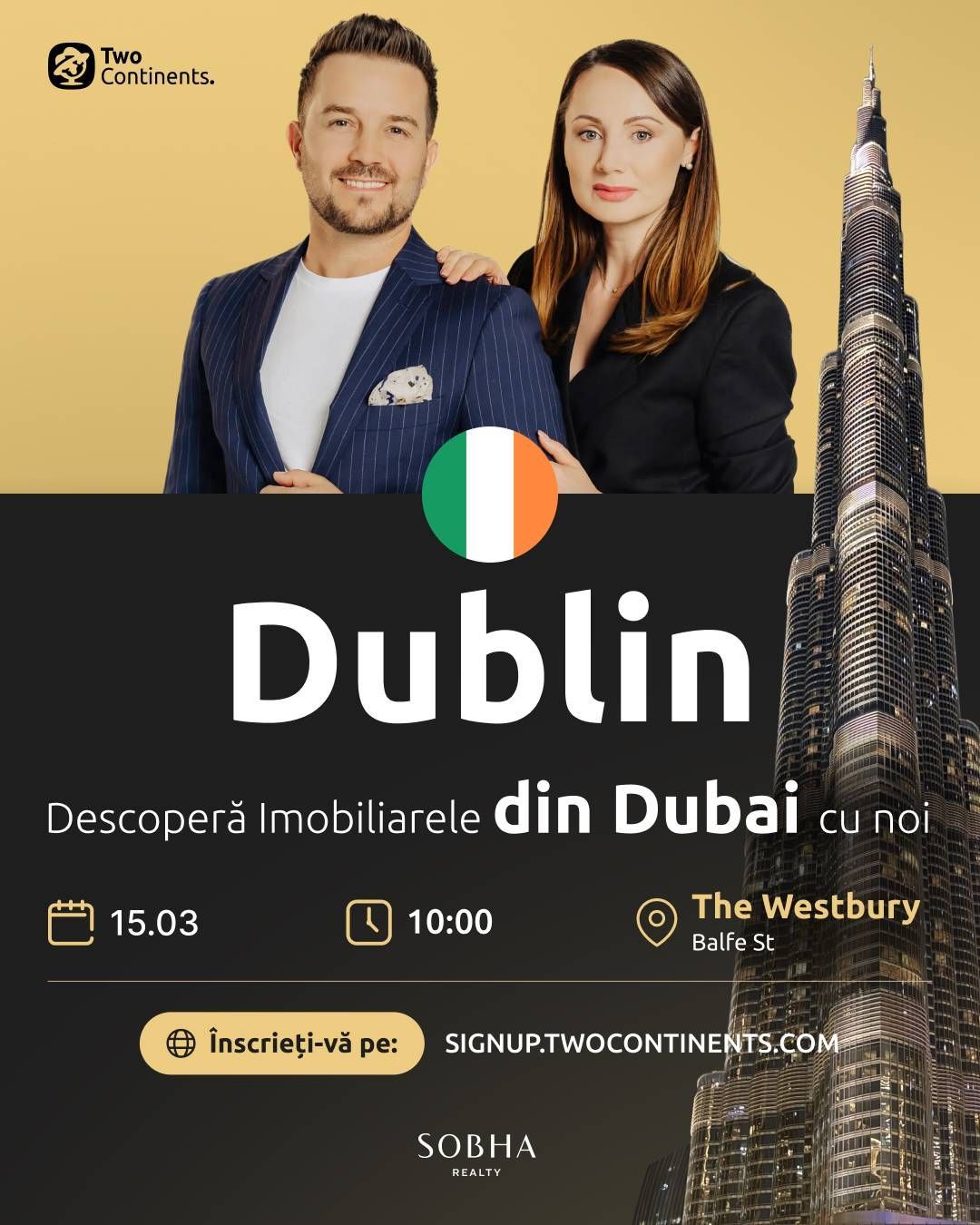 Întâlnirile vor fi conduse de Andrei și Cristina Racoviță fondatori Two Continents! Va fi prezent și un reprezentant al Sobha Realty, al doilea cel mai mare dezvoltator imobiliar din Emiratele Arabe Unite.